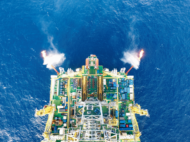 我国加快发展新能源和可再生能源,能源消费结构不断优化。2020年,我国率先实现水平井钻采深海“可燃冰”。图为我国海域天然气水合物第二轮试采平台“蓝鲸2号”喷出双火焰(2020年3月25日摄)。 新华社发 广州海洋地质调查局供图