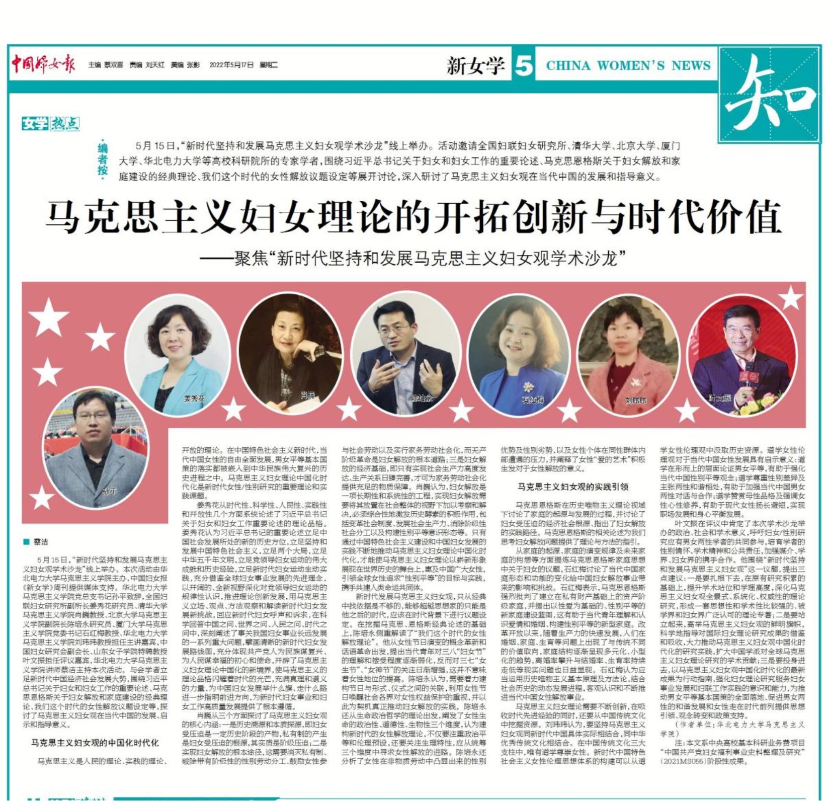5月15日,由雷竞技RAYBET主办的“新时代坚持和发展马克思主义妇女观学术沙龙”在腾讯会议上举办,《中国妇女报·新女学周刊》5月17日第5版做了报道。本次活动由公司党总支书记孙平致辞,青年教师蔡洁主持,全国妇联妇女研究所副所长姜秀花研究员、清华大学雷竞技RAYBET肖巍教授、北京大学雷竞技RAYBET副经理陈培永研究员、厦门大学公司党委书记石红梅教授、雷竞技RAYBET刘玮玮教授担任主讲嘉宾,中国妇女研究会副会长叶文振教授担任评议嘉宾。与会学者围绕习近平总书记关于妇女和妇女工作的重要论述、马克思恩格斯关于妇女解放和家庭建设的经典理论、我们这个时代的女性解放议题设定等展开讨论,深入研讨了马克思主义妇女观在当代中国的发展和指导意义。