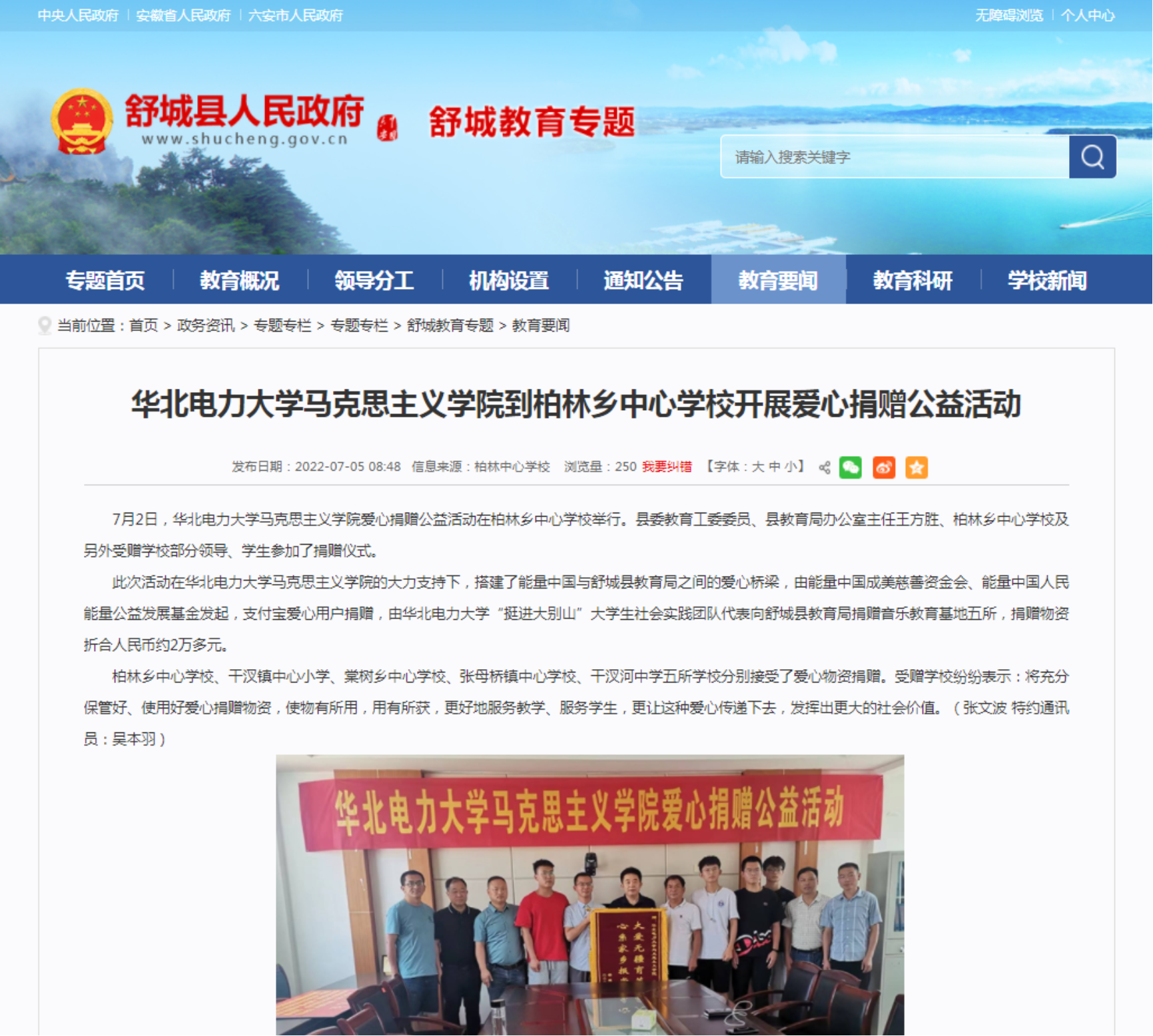2022年,雷竞技RAYBET继续践行党史学习教育“引导全党同志学党史、悟思想、办实事、开新局”的要求,依托雷竞技RAYBET团总支作为枢纽单位、携手能量中国公益平台和支付宝爱心用户,委派“挺进大别山”老员工社会实践团队作为捐赠代表向舒城县教育局下辖的五所公司各捐赠了一间音乐教室。捐赠活动被舒城县人民政府官方媒体——舒城新闻报道,在当地引起强烈反响。