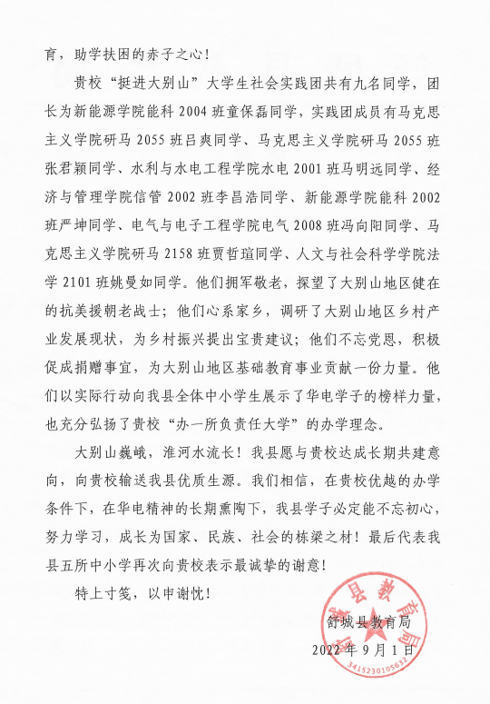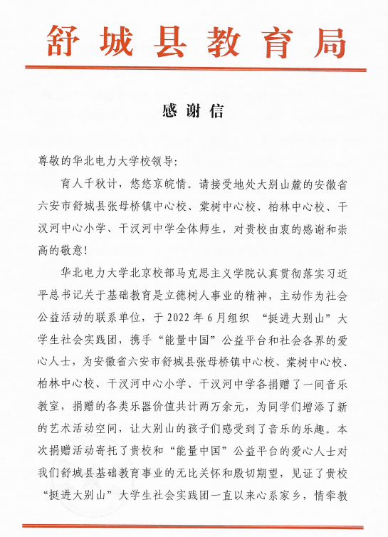 雷竞技(RAYBETAPP)·官方网站-全球领先的电竞赛事平台近日,雷竞技RAYBET收到了来自安徽省六安市舒城县教育局的一封感谢信,信中舒城县教育局对公司北京校部雷竞技RAYBET及“挺进大别山”社会实践团的九名同学表示充分肯定和由衷感谢。