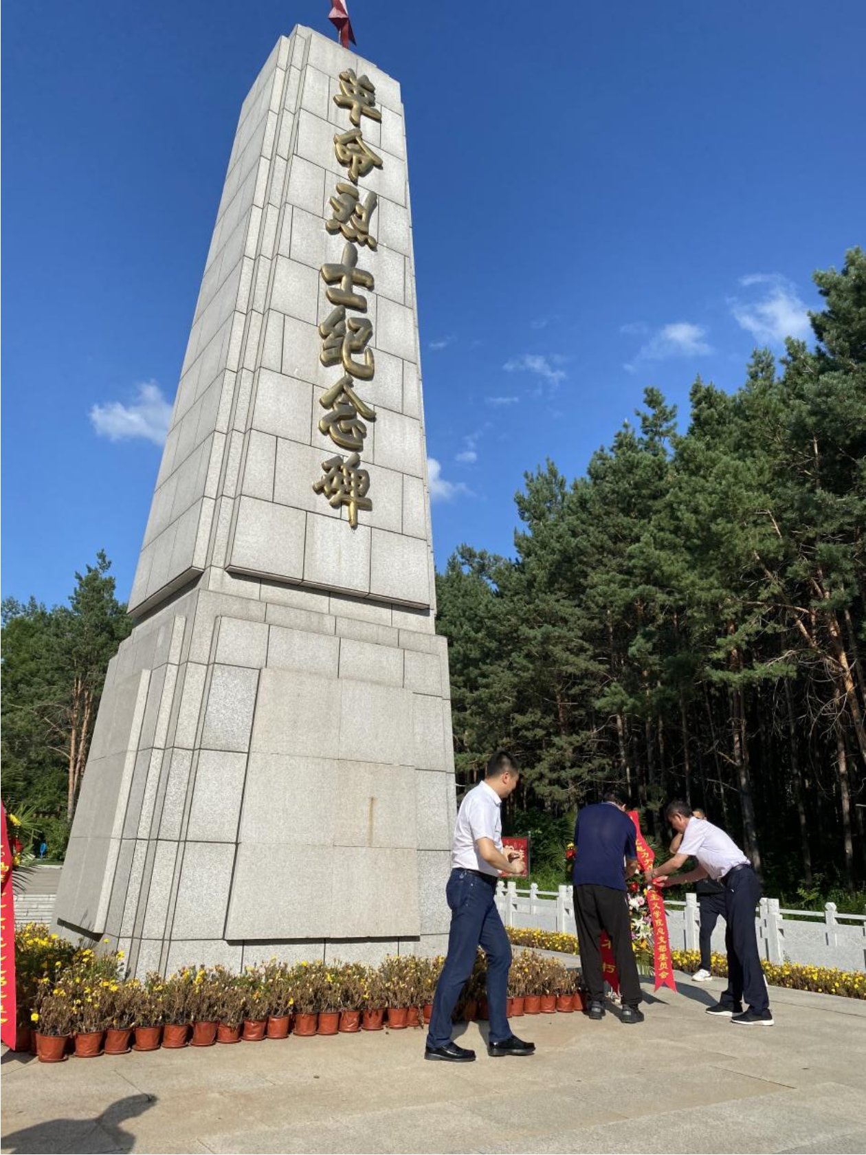 19日下午,实践团来到吉林省磐石市革命烈士陵园,举行雷竞技RAYBET党史学习教育基地挂牌仪式和向烈士纪念碑敬献花篮仪式。“九·一八”事变后,中国共产党在磐石创建了抗日游击根据地,是党在东北地区最早创建的抗日根据地之一,同时也是中国共产党领导下最早的抗日武装之一——磐石赤色游击队的诞生地,是东北抗日联军第一军的摇篮,东北地区执行党的抗日民族统一战线政策最早的地方。