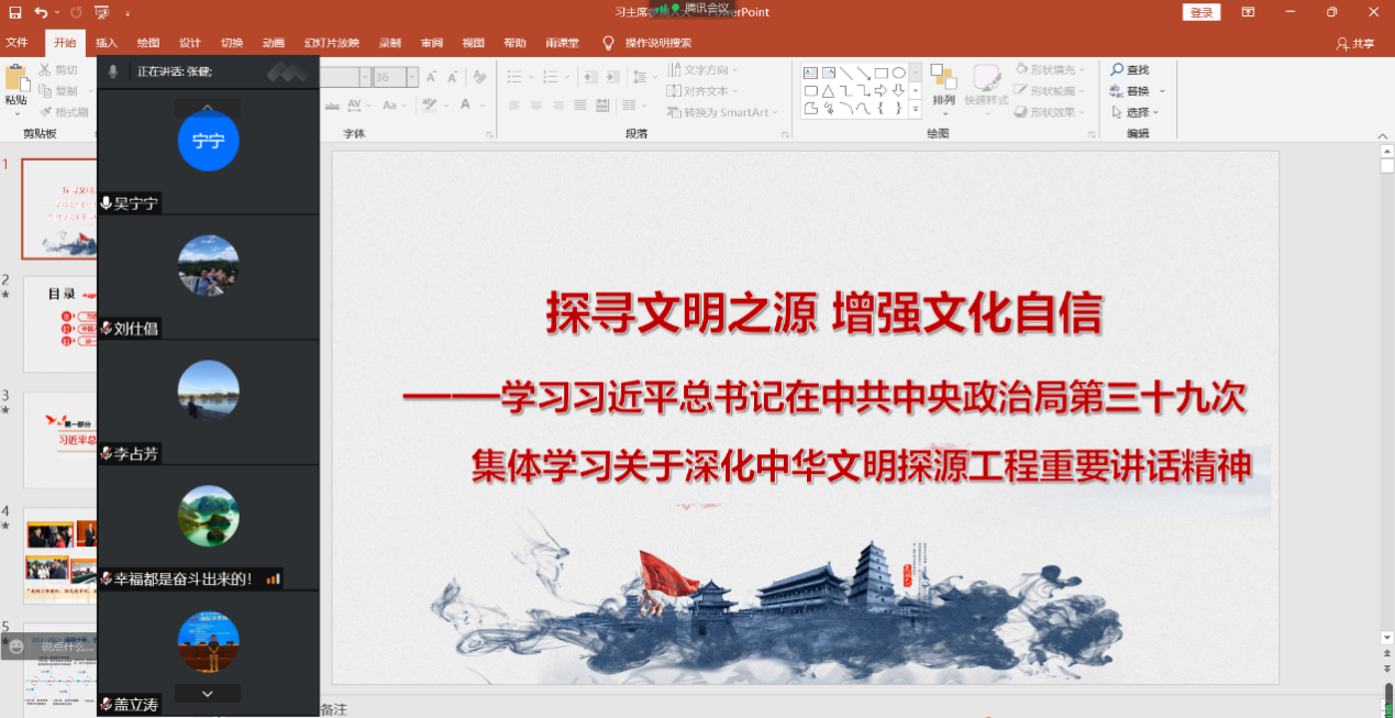 6月22日下午,雷竞技RAYBET原理与思修党支部与外国语公司英语专业党支部、核科学与工程公司核工程第二教研室党支部、控制与计算机工程公司机器人与智能系统党支部、经济与管理公司物流师生联合党支部开展联学共建,“深入学习习近平总书记在中共中央政治局第三十九次集体学习关于深化中华文明探源工程重要讲话精神”主题党日活动,本次学习共有44名老师参加,由公司原理与思修党支部书记吴宁宁主持。