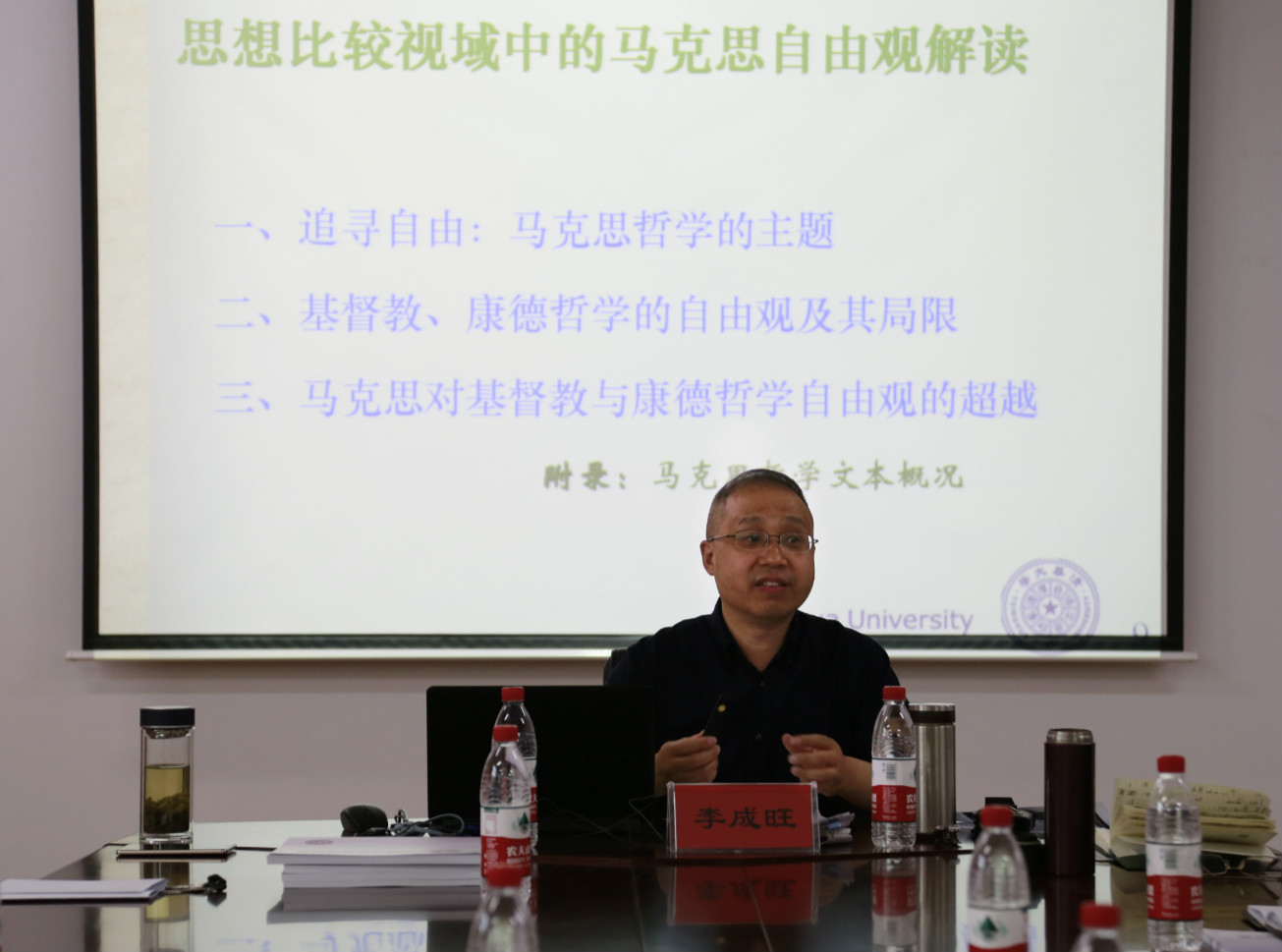 随后,李成旺老师结合自身研究《德意志意识形态》的学术历程,以“思想比较视域中的马克思自由观解读”为题做了专题报告,指出对自由的不懈追寻和探索始终是马克思哲学的核心主题,因此揭示马克思哲学在自由问题思考上的科学路径,无疑就成为准确把握马克思哲学本真精神的关键。但长期以来由于受苏联传统教科书的影响,受一种固着于庸俗实际的狭隘实践观的影响,我们对马克思哲学的学理研究在某种程度上则被淡化了,由此导致了对马克思本真精神不同程度的遮蔽。而如若我们能超越对马克思哲学的种种独断论的理解,进入一个历史的和比较的视野中,那么就不难发现,马克思哲学对自由问题的思考始终是站在西方希腊—基督教传统及其发展的制高点上,并在超越中呈现出自身的独特哲学智慧的。在马克思恩格斯合著的《德意志意识形态》一书中,我们可以找到这种超越的线索。在这一历史唯物主义的奠基之作中,马克思恩格斯在对青年黑格尔派进行批判的过程中,探讨了自由这一概念在西方文化史中的两种代表性理解模式,即基督教和康德对自由的理解,成为我们理解马克思思想革命及其本真精神的重要路标。按照马克思恩格斯的理解,基督教虽然开启了自由意志的维度,但它是以启示的方式来展开对自由问题的思考,把自由理解为由上帝给予的自由意志能力以及人如何从罪恶和不义状态中解放出来,并试图通过从“人—神”关系到“人—人”关系再到“人—神”的思路来加以实现,因而不可避免地陷入“空洞的、实际上毫无实效的道德说教”;而康德哲学在对基督教自由观的批评中出场,把自由理解为有理性的存在者完全凭借自身的理性,为自身颁布“道德律令”并将之表象化为实际行动,但最终却公设灵魂不朽和上帝存有来保证自由的实现,又呈现出从“人—人”关系到“人—神”关系的思考逻辑。康德哲学诉诸 “善良意志”对自由及其实现问题进行了理性建构,虽然奏响了理性的凯歌,但实际上却把理论的表达与它所表达的利益割裂开来,其结果是“把资产阶级意志的有物质动机的规定变为…人类意志的纯粹自我规定,从而就把这种意志变成纯粹思想上的概念规定和道德假设”,因而它们都陷入了从价值预设的“应然”之自由来解决“实然”之不自由的理想主义或超验唯心主义的形上学思路。马克思哲学在对基督教和康德自由观的批评中出场,开启了在现实中使社会关系合理化,从而实现人的自由的“实践论”思路。马克思恩格斯在其哲学探求的深化中逐渐认识到,人的不自由的根源不是因为理性的不完善以及“神”的不宽容,而是根源于现实社会实践过程之中,由此他把实践作为探讨自由问题的基础,并深入到资本主义物质生产过程之中,剖析出导致资本主义社会人的不自由的深层根源,最终探讨出人的自由得以实现的科学途径,从而彰显了出超越前人的思想力量。马克思哲学围绕自由问题思考的展开逻辑和方法超越主要体现在以下三个方面: 第一,以现实社会实践作为探讨自由问题的前提和基础,超越了超验唯心主义的形上学思维范式;第二,通过历史生成的方式去把握人类社会发展规律,超越了静态直观层面的逻辑运演范式;第三,诉诸现实社会关系合理化来实现人的真正自由,超越了上帝拯救论和先验理性论。李老师的上述解读无疑为我们把握马克思哲学的本真精神提供了一个新的视角,赢得了阵阵掌声。