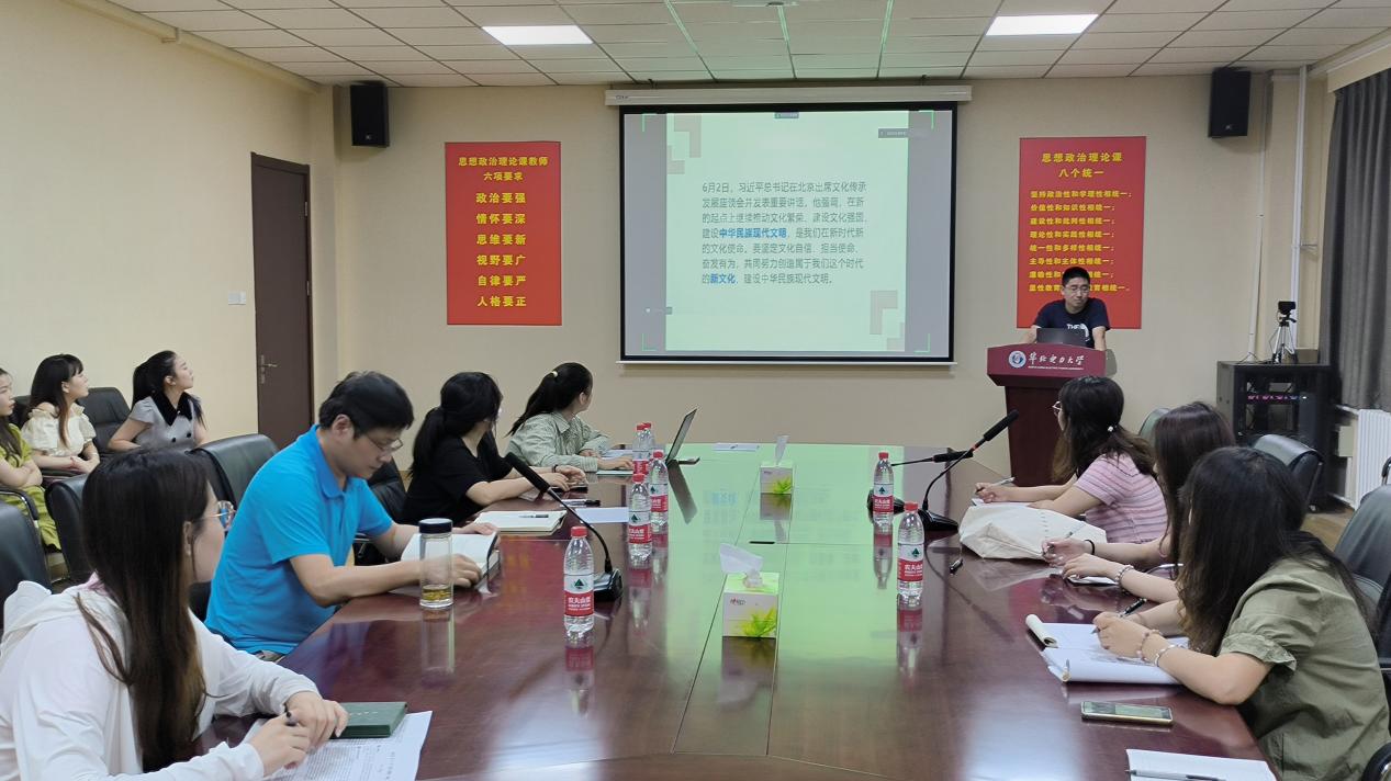 首先,由原理与思修党支部盖立涛老师作“巩固文化主体性,建设中华民族现代文明”主题宣讲。他指出,习近平总书记6月2日在北京出席文化传承发展座谈会上强调,在新的起点上继续推动文化繁荣、建设文化强国、建设中华民族现代文明,是我们在新时代新的文化使命。要坚定文化自信、担当文化使命、奋发有为,共同努力创造属于我们这个时代的新文化,建设中华现代文明。盖老师从深刻把握中华文明的突出特性,全面理解“两个结合”的重大意义和更好担负起新的文化使命,推进文化繁荣发展三个方面进行详细讲述,使师生党员同志们深刻认识到坚定文化自信,巩固文化主体性,努力建设中华民族现代文明的重要意义。