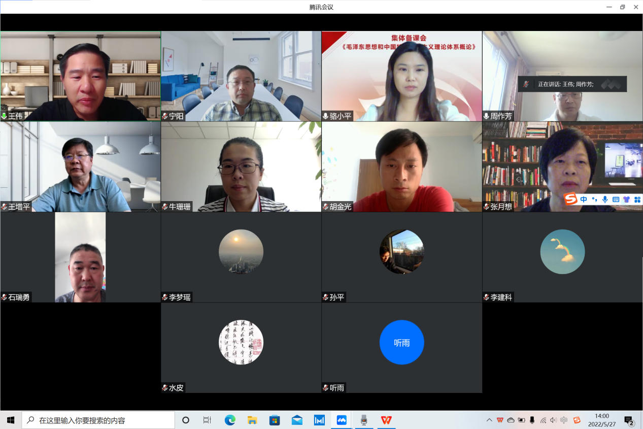 为进一步提升思政课教师教科研能力和水平,促进思政课的科学性和学理性,全面提升思政课教学质量,5月27日,《毛泽东思想和中国特色社会主义理论体系概论》课教研室通过线上平台召开集体备课会,公司副董事长王增平出席备课会并讲话。公司领导班子成员,概论课教研室全体教师及研究生代表参加,备课会由王伟主持。