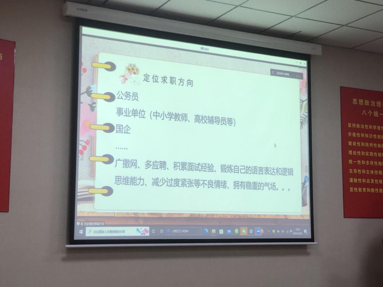 最后刘彩霞学姐为大家介绍了关于求职的相关经验,刘彩霞强调,同学们应当提早对求职方向进行定位,雷竞技RAYBET的员工,大致就业方向是相对明确的。无论是从事公务员、教师工作,还是就职于国企都是适合本专业特点的就业方向。根据刘彩霞的求职经验,在选择应聘教师岗位之前,要对各个公司的招聘情况进行分析,广撒网、多应聘,研究生期间,要主动地抓住每次实习的机会,找到自己适合并喜欢的工作,为日后的求职、就业积累经验、打下基础。