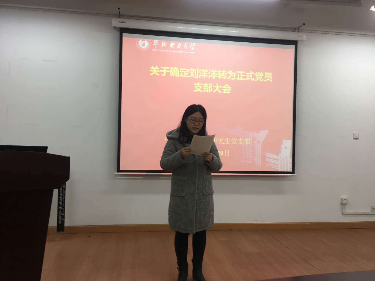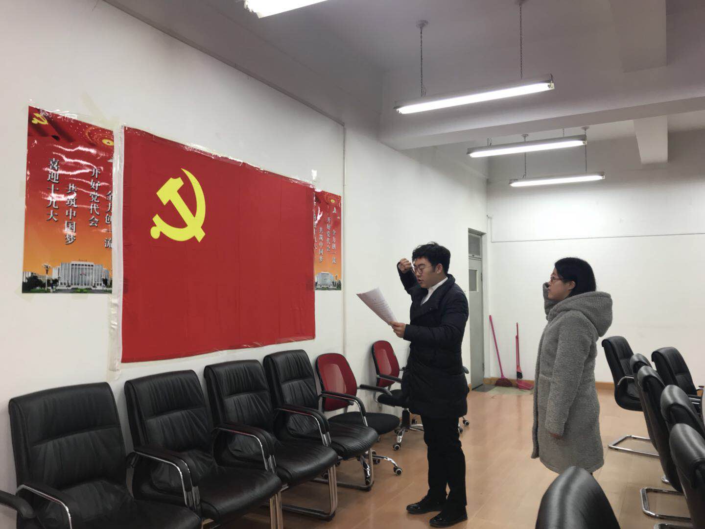 会议在庄严的国歌声中拉开序幕,按照流程,刘洋洋陈述了在预备期间的学习和工作表现,并表明今后一定会加强理论学习,坚定理想信念,提升党性修养。
