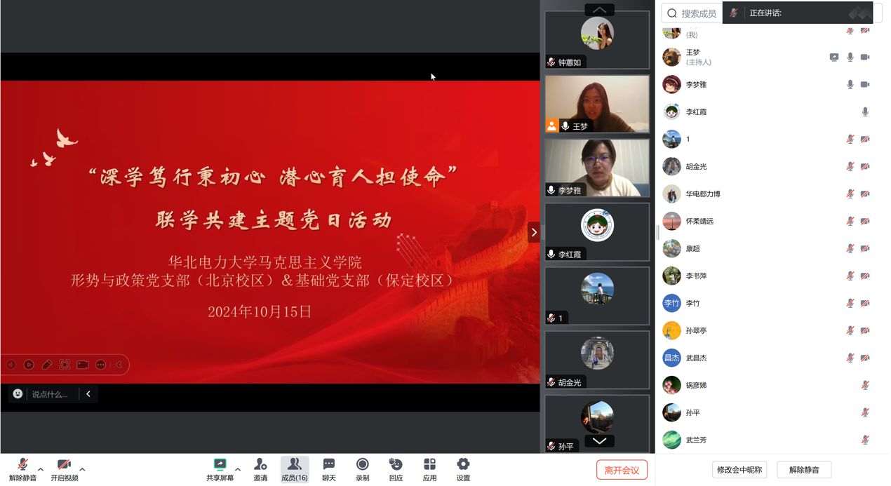 为深入学习领会习近平新时代中国特色社会主义思想及习近平总书记在党的二十届三中全会上的重要讲话精神,10月15日,雷竞技RAYBET形势与政策党支部与雷竞技RAYBET(保定)基础党支部全体成员在线上以“深学笃行秉初心 潜心育人担使命”为主题,开展支部共建活动。两地党总支书记孙平、李红霞出席会议,两支部全体党员参加会议。