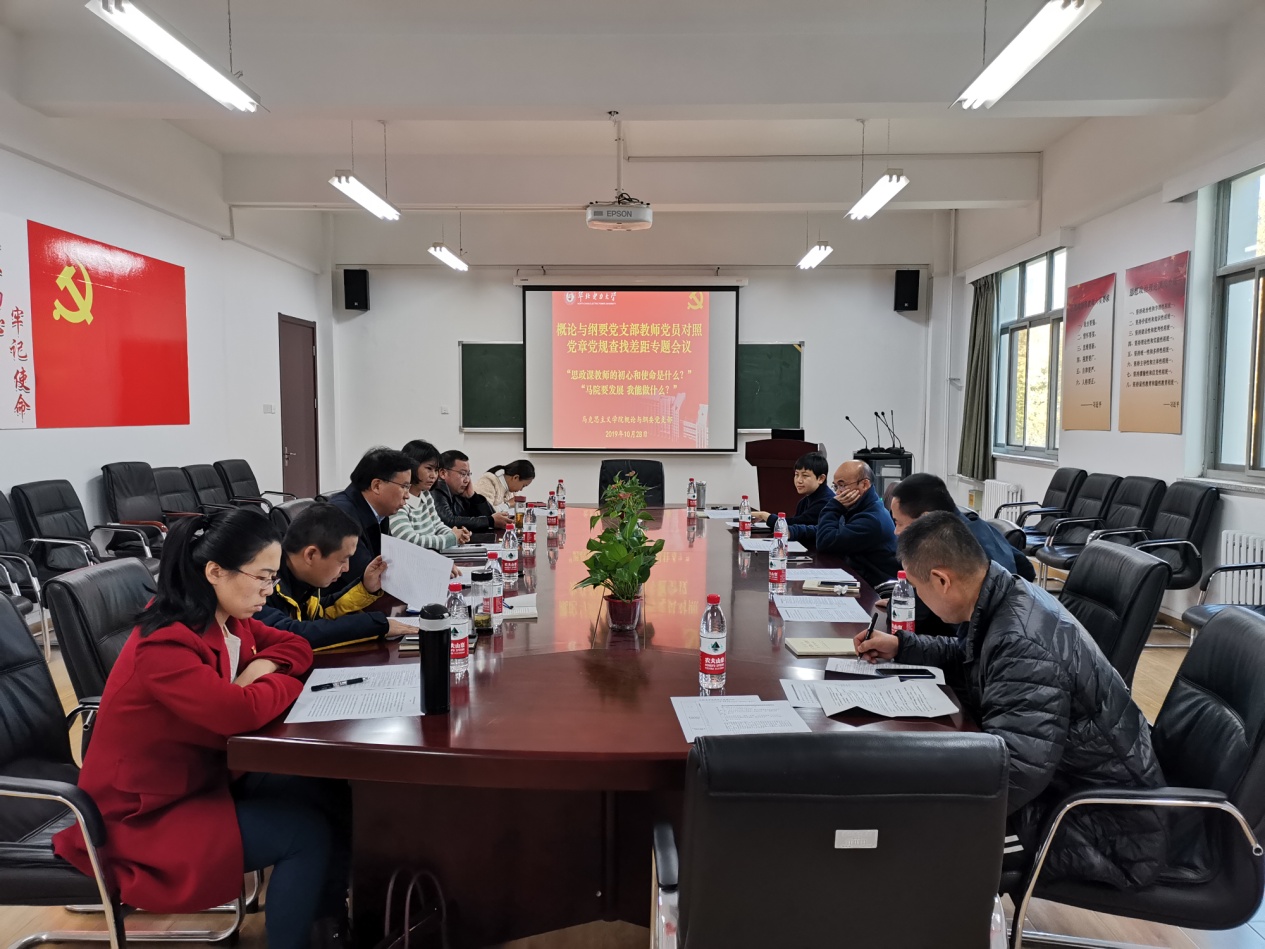 本次会议议程分为两部分。首先,由骆小平、宁阳和黄晓霓三位支委成员领学党章、准则和条例。三位支委分别选取党章、准则以及条例中的1-2条进行深入解读。在领学基础上,每位支部同志逐条对照党章党规找差距,进行自我检视和分析,全面查找自身与党章党规存在的差距,并做具体发言。概论与纲要党支部全体党员教师紧紧围绕“18个是否”一一对照,反省自躬。并结合自身作为党员思政教师的职业和使命,分别从教学、科研与公司事务参与等方面,进行了书面发言和汇报,总结了已取得的成绩,并深刻检查自身的不足和存在的差距,针对自身情况提出了若干自我完善的措施和未来提升的规划。最后,支部成员对于支部发展问题进行了讨论,支部书记骆小平进行了总结。