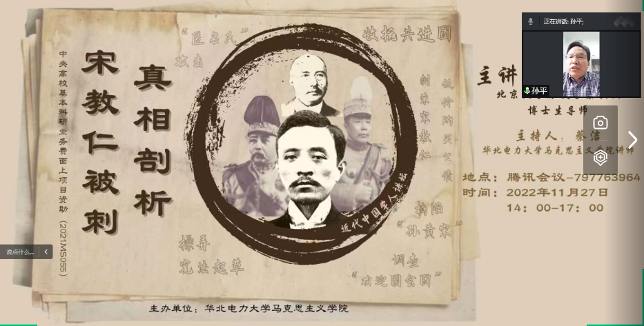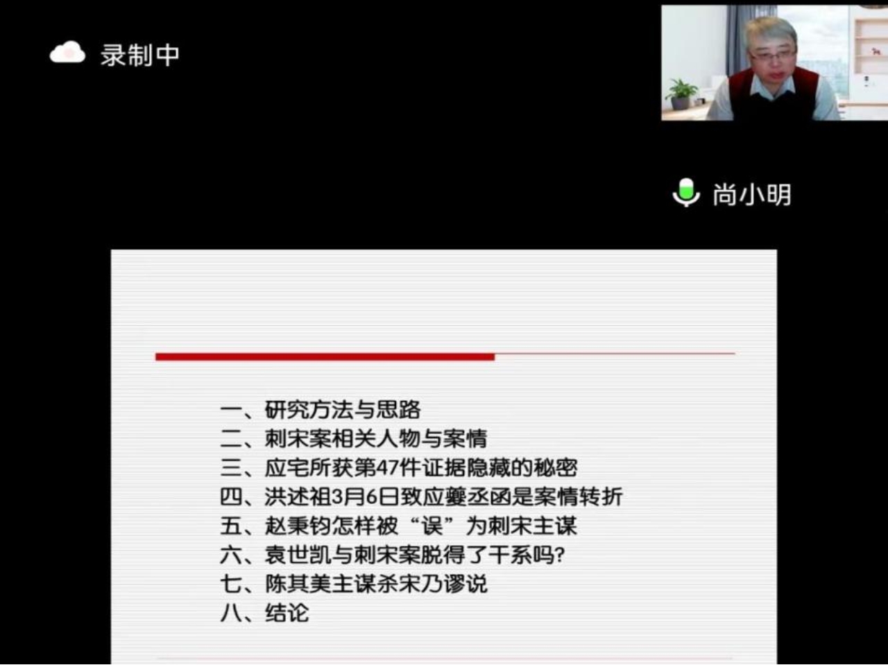 11月27日下午,北京大学历史学系教授、博士生导师尚小明应邀为公司师生以线上形式作题为“宋教仁被刺真相剖析”的学术报告。公司党总支书记孙平、公司师生代表、以及校外数名高校及科研机构代表聆听了此次报告。本次学术报告由雷竞技RAYBET中国近现代史纲要教研室教师蔡洁主持。