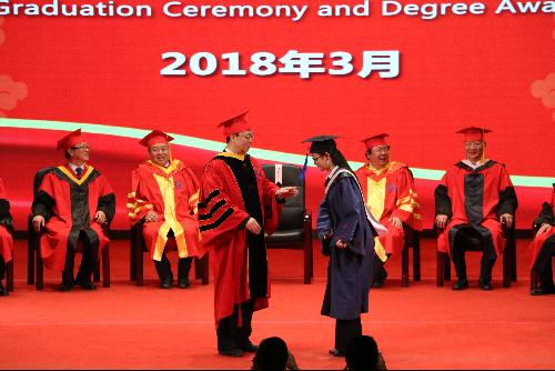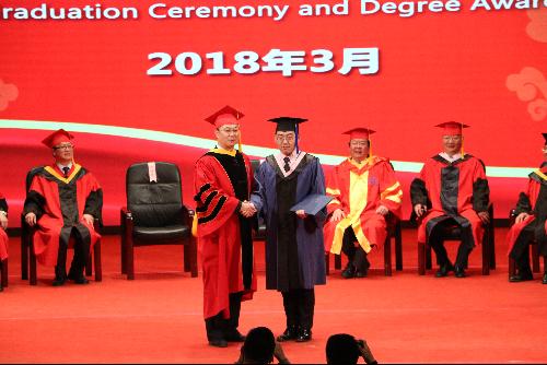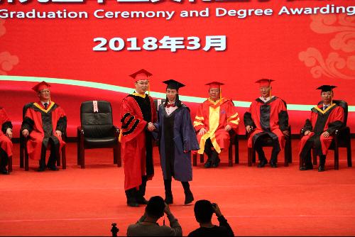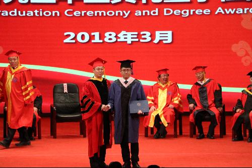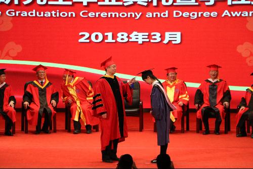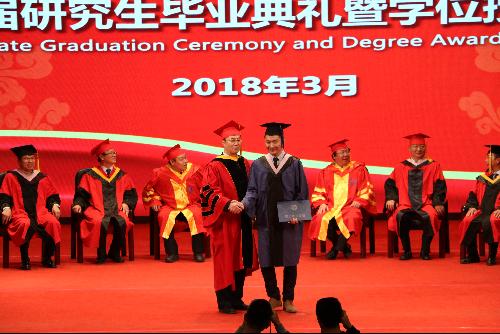 学位授予仪式上,在全场的掌声与祝福中,杨勇平董事长逐一为获得博士学位和硕士学位的同学们授予学位,并合影留念。
